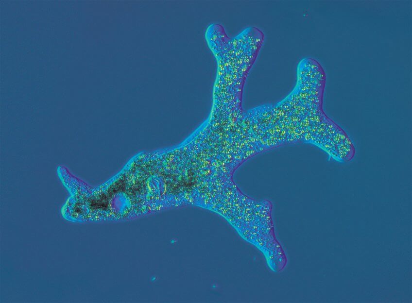 Les amibes changent de forme selon les circonstances. Elles se glissent dans les plus petits interstices pour dénicher des bactéries qu’elles enlacent de leurs pseudopodes avant de les digérer. On estime à 850’000 leur nombre dans un seul gramme de terre. Leur rôle dans le recyclage de la matière vivante est certainement sous-estimé.