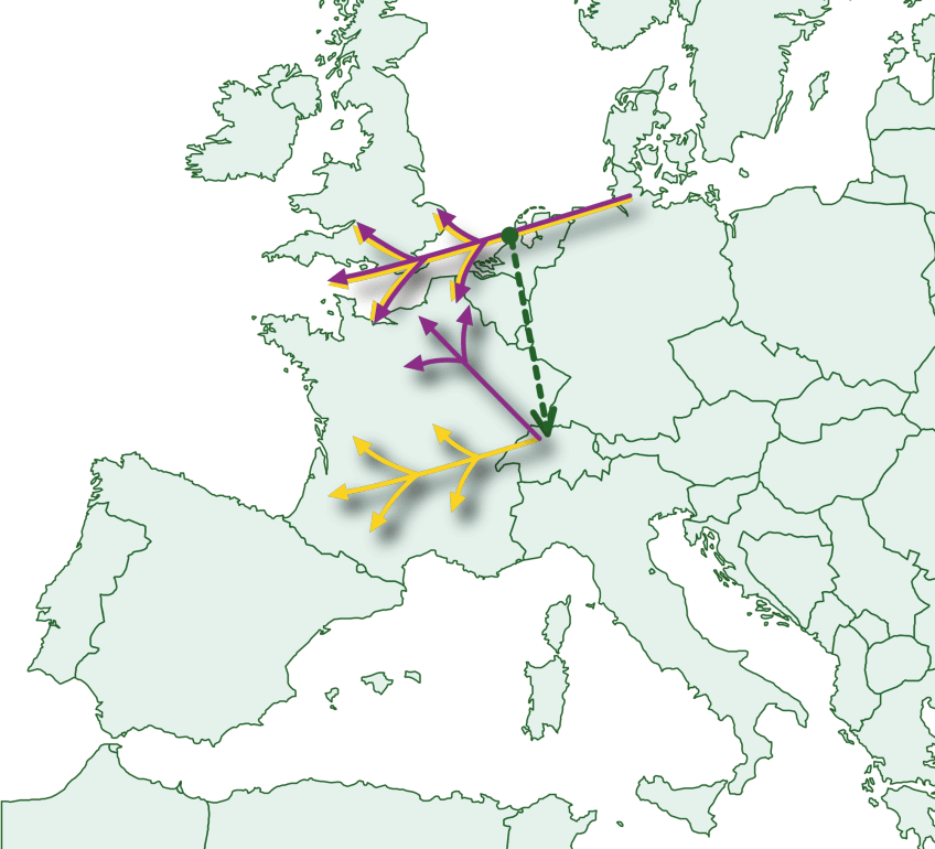 Une fois libérés, les jeunes (en jaune) ont imperturbablement repris leur cap Ouest-Sud, passant l'hiver dans le Midi. Les adultes (en violet) en revanche ont corrigé leur trajectoire pour rejoindre leurs quartiers traditionnels dans le Nord de la France et en Angleterre.