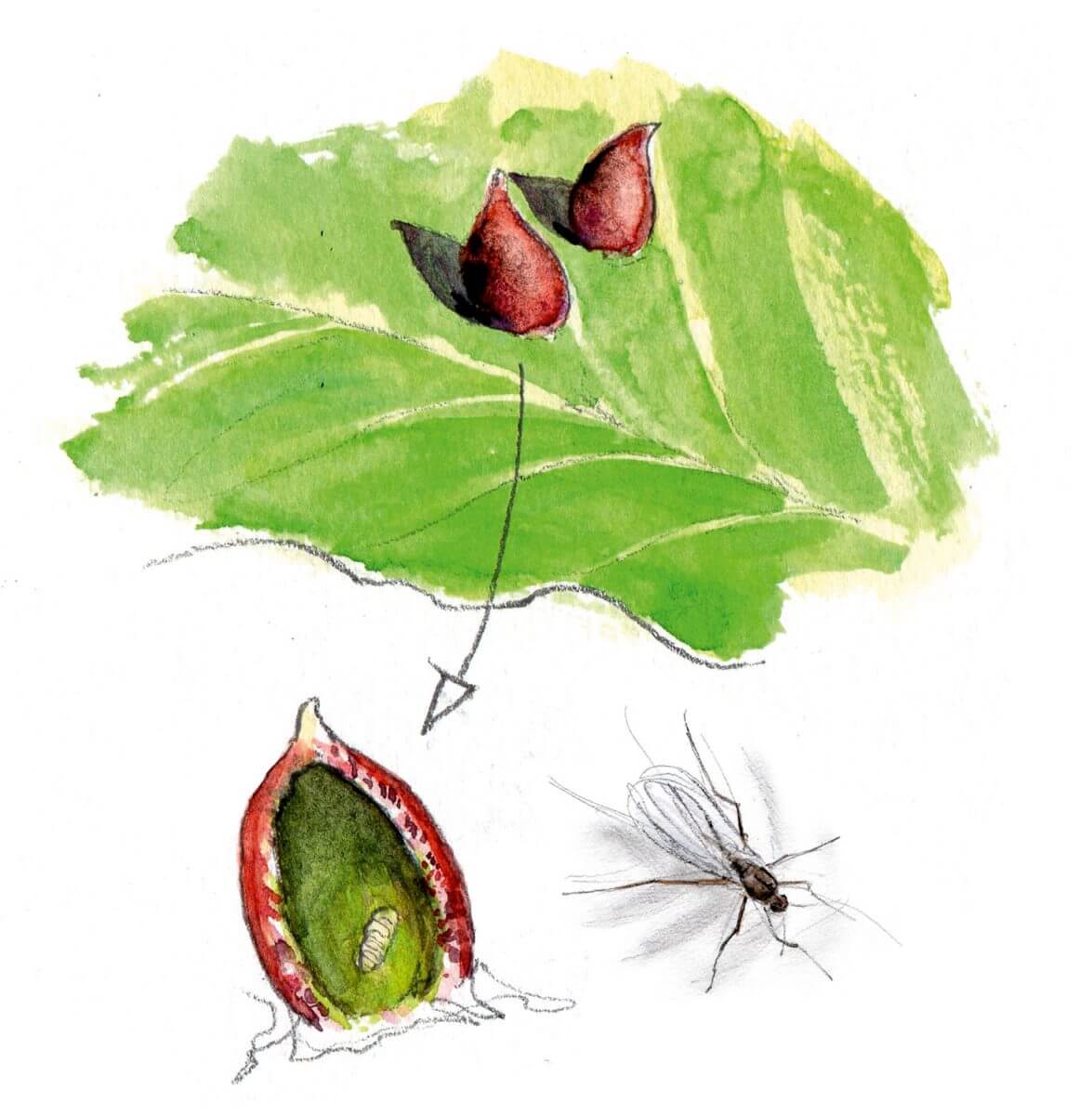 Sans doute avez-vous déjà remarqué de petites verrues ventrues et pointues sur une feuille de hêtre ? Ce sont des galles. Si vous ouvrez l'un de ces coffres-forts végétaux, vous trouverez un vermisseau bien protégé : la larve de la cécidomyie du hêtre. En automne, la galle tombe par terre avec la feuille. Début avril, elle libère un moucheron minuscule. Après l'accouplement, la femelle pond ses œufs sur des bourgeons de son arbre hôte juste avant la feuillaison. La salive des jeunes larves provoque la croissance de la galle qui les abrite et les nourrit tout à la fois. On connaît des centaines d'espèces de cécidomyies dont certaines s'attaquent à des plantes cultivées.