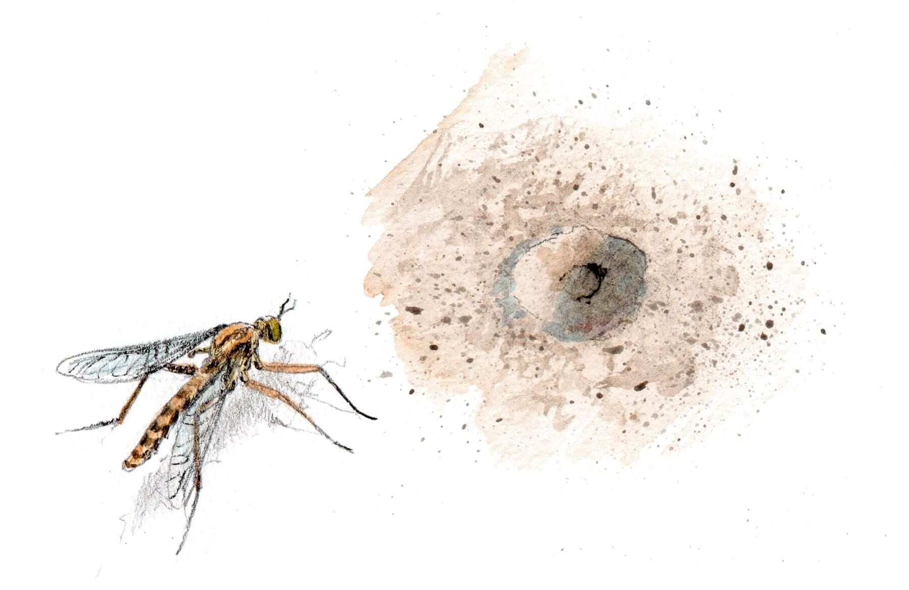 Peut-être connaissez-vous le fourmilion, cet insecte à l'allure de libellule dont la larve creuse un entonnoir pour piéger les fourmis. L'asticot d'une jolie mouche tout aussi élégante fait de même. Le ver-lion creuse le sable durant la nuit pour aménager un traquenard cylindrique. Quand une proie s'aventure dans l'entonnoir, le chasseur à l'affût la bombarde de sable pour la faire glisser au fond du piège et la ceinturer par le milieu du corps. Puis le ver-lion injecte sa salive venimeuse dans sa victime pour la tuer et dissoudre ses tissus. Après quoi, il n'a plus qu'à aspirer les chairs liquéfiées. Ses entonnoirs sont un peu plus petits et moins évasés que ceux du fourmilion. On les reconnaît à leur fond arrondi comme celui d'un minuscule coquetier.