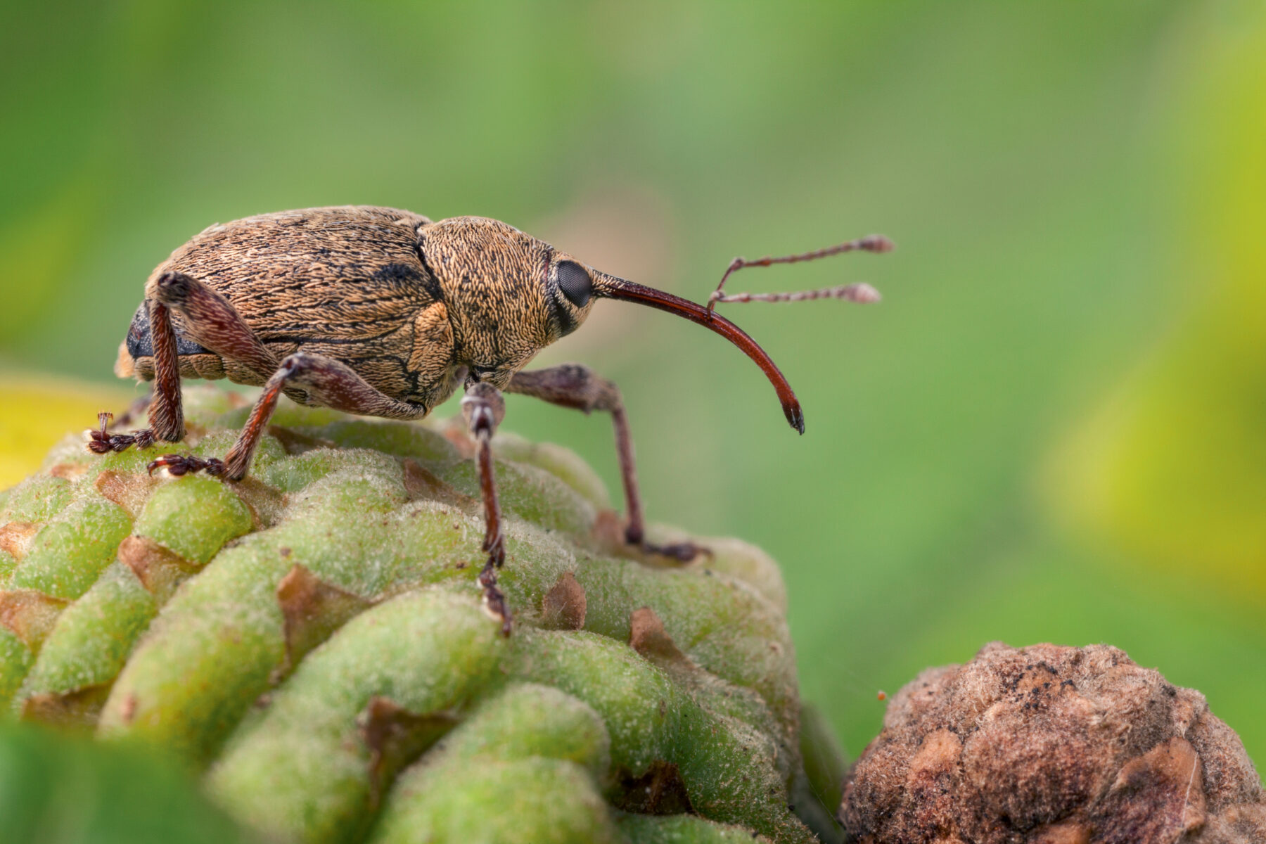 C’est un roc, c’est un pic, c’est un cap ! L’interminable « nez » du balanin des glands lui confère une allure inimitable. Chez la femelle de ce coléoptère, le rostre est 2 à 3 fois plus développé que celui du mâle et peut atteindre la longueur du corps. Elle utilise cet appendice pour percer la cupule et la coque des glands afin d’y pondre ses œufs. La structure microscopique de cet appareil de forage lui donne assez de souplesse pour se courber, tout en étant assez rigide pour éviter qu’il ne plie ou ne rompe sous l’effort.