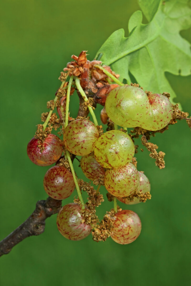 Rien qu’à lire son nom, on se doute que la guêpe Neuroterus quercusbaccarum ne fait pas les choses simplement. Mâles et femelles d’une première génération se reproduisent à la fin du printemps et leurs œufs sont pondus sur les chatons du chêne. Ces derniers réagissent en formant des excroissances semblables à des groseilles, qui servent d’abri et de nourriture aux larves. En fin d’été, une deuxième génération émerge de ces galles, composée uniquement de femelles ! Pas de souci, elles pondent sous les feuilles sans avoir besoin de s’accoupler, ce qui provoque l’apparition de petites lentilles rougeâtres. Celles-ci grossissent, tombent à terre à l’automne et ce n’est qu’au printemps suivant qu’une nouvelle génération sexuée en émerge pour boucler le cycle.