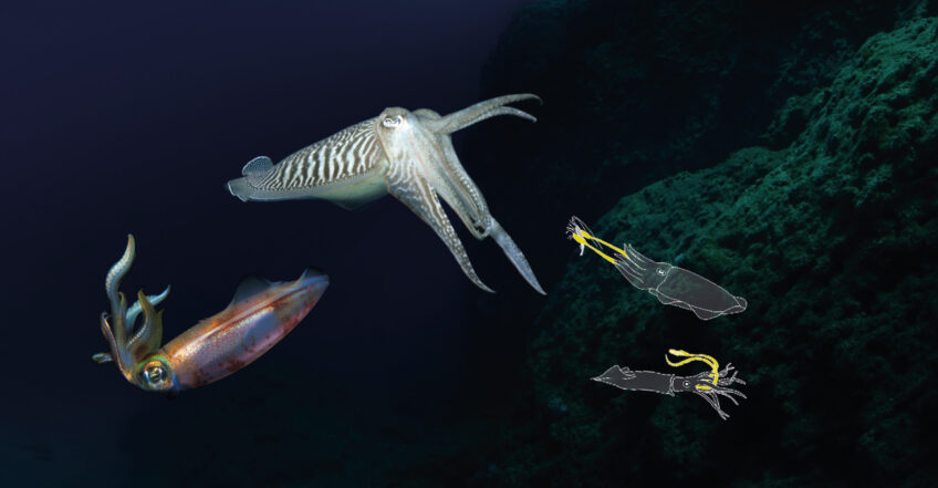Les deux tentacules de la seiche commune et du calamar commun sont ici invisibles. Élastiques et rétractables, ces armes de chasse redoutables jaillissent de façon fulgurante pour capturer la proie (> schémas).