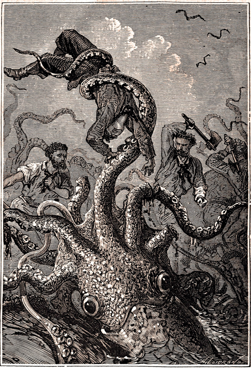 La confusion est totale entre les évocations de calamars et de poulpes géants. L’iconographie qui accompagne les innombrables éditions et traductions du célèbre roman d’aventures de Jules Verne est un joli méli-mélo de bras et de tentacules ambigus. La créature tient finalement du monstre légendaire hybride, inspiré du kraken scandinave et démontrant la relative méconnaissance et la mythification des céphalopodes sous--marins à l’époque.