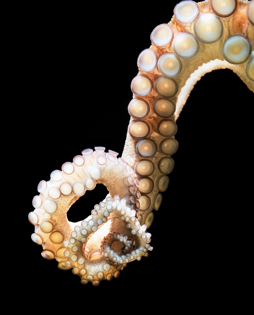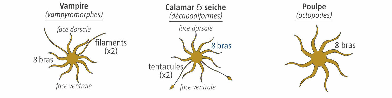 Les calamars et seiches, d’une part, en ont deux supplémentaires, ventraux, évolués en tentacules. Et les vampires, d’autre part, chez qui la paire en plus, dorsale, est transformée en filaments sensoriels. Sur les bras, des ventouses courent tout au long de la face orientée vers la bouche. Alors que sur les tentacules, généralement plus longs, les ventouses sont concentrées sur l’extrémité spatulée.