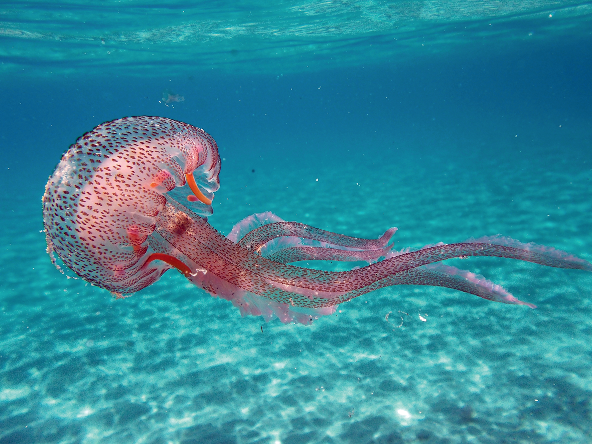 Non, ce n’est pas un poulpe pour autant, ni même un mollusque. Il s’agit d’une méduse, un nom générique pour décrire des animaux gélatineux appartenant au groupe des cnidaires. En d’autres termes, les méduses, même si elles sont libres et non fixées au substrat, comptent parmi leurs proches cousins, en plus des anémones de mer, les coraux ! À vingt mille lieues des céphalopodes.