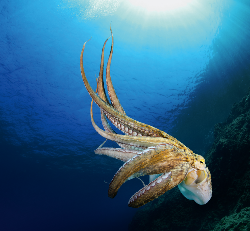Le corps d’abord, la tête ensuite et enfin les bras… le poulpe nage à reculons, parfois jusqu’à 40 km/h !