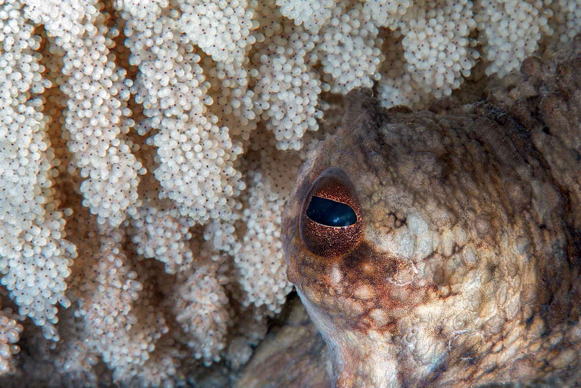 Dans la famille pieuvre, on est plutôt mère poulpe. La plupart des espèces de fond pondent sur le substrat et souvent dans leur gîte. Prenons le cas du poulpe commun. Entre 100 000 et 500 000 œufs, dépourvus de véritable enveloppe protectrice et agglomérés en grappes, sont fixés au plafond de la grotte. La femelle peut prendre un mois pour cette entreprise. Ensuite, elle ventile et surveille tout ce petit monde jusqu’à l’éclosion, sur une durée très variable – entre un et quatre mois –, en fonction de la température de l’eau. Là où l’histoire devient triste, c’est que la génitrice se sacrifie complètement durant cette phase de garde en ne s’alimentant pas. Maman poulpe meurt donc avant la naissance de ses rejetons. Et papa, qui ne s’occupe pas du tout de sa descendance, ne fait pour autant pas de vieux os – enfin si on peut dire…