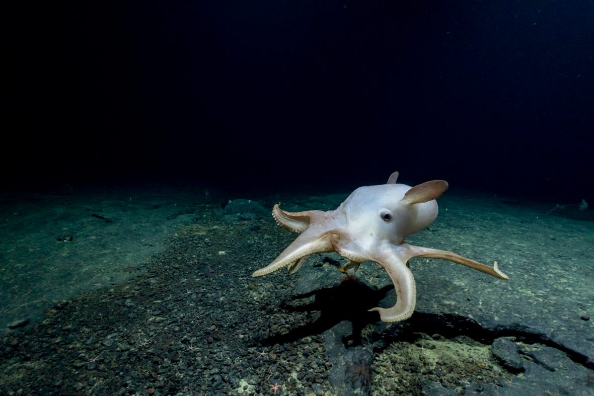C’est l’histoire d’une rencontre entre une femme et un petit poulpe aux airs de Dumbo qui vit dans le secret des abysses.