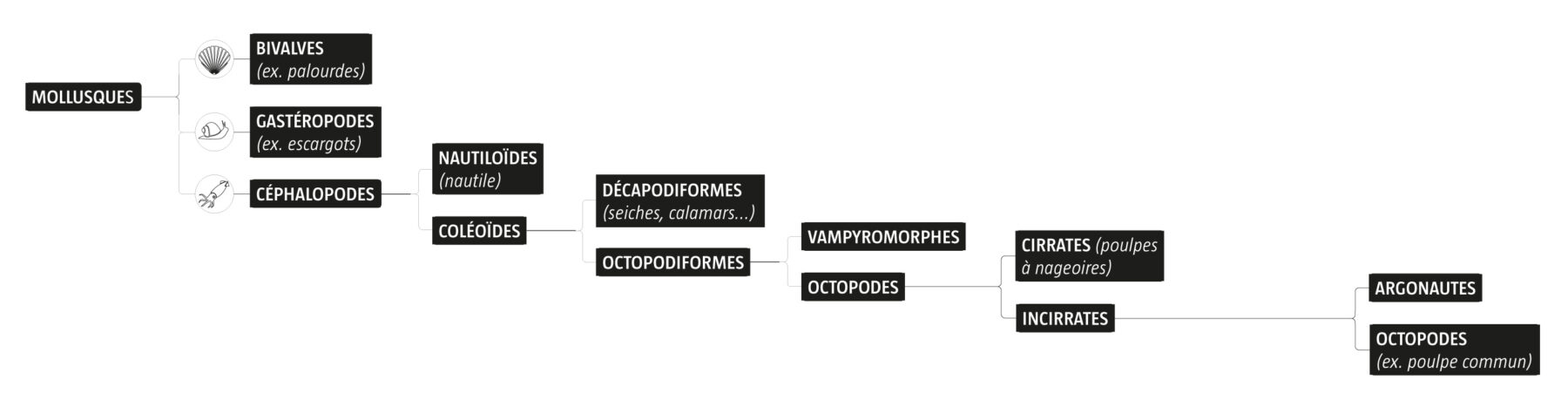 Comme on parle généralement de bras, c’est vrai qu’il y a de quoi en perdre son latin ! Ce groupe d’animaux au corps mou fait partie de l’univers des mollusques, tout comme les bivalves et les gastéropodes. Très différents de leurs cousins, huîtres ou limaces, les poulpes sont rangés dans la classe des céphalopodes qui comprend notamment un représentant vieux comme le monde et singulièrement équipé d’une coquille : le nautile. D’autres proches cousins ont dix membres, ce sont les décapodiformes : calamars et seiches. Ne pas confondre ces derniers avec les décapodes, ces crustacés à cinq paires de pattes dont les crabes, écrevisses et autres homards sont d’illustres figures.