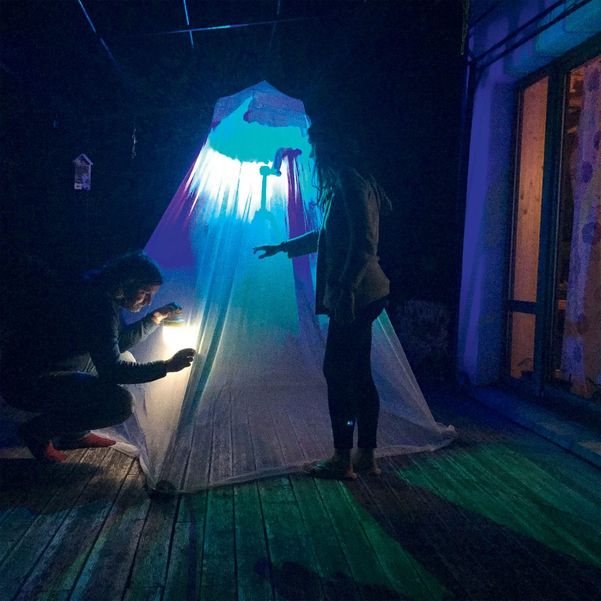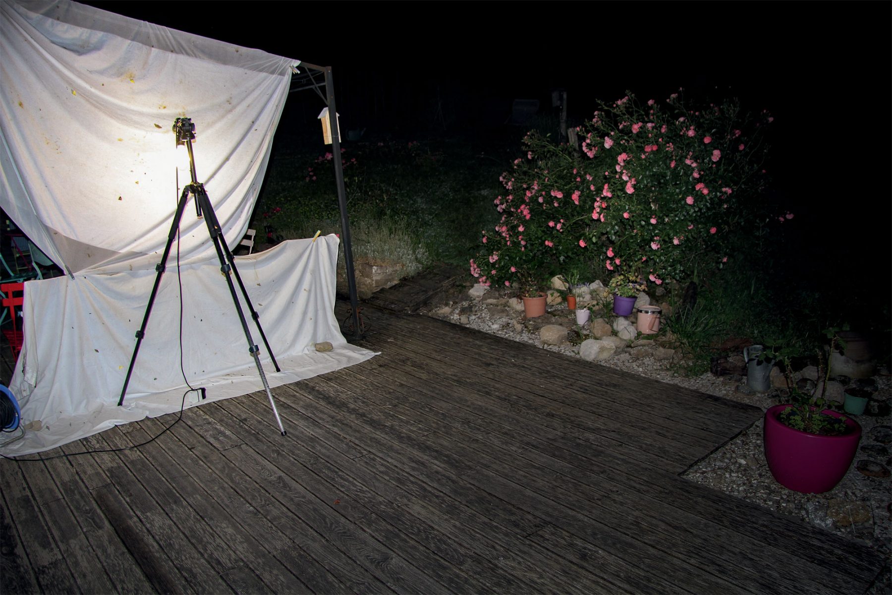 Ciel voilé, lune absente, vent tombé, température agréable de 17 °C, les conditions sont réunies pour une soirée papillons. Je réunis le matériel sous le regard à la fois habitué et dubitatif de la famille : trépied emprunté à la longue-vue, lampe LED spéciale papillons achetée en Allemagne, batterie USB chargée à bloc et, en guise d’écran, une moustiquaire pour bébé de 2 m de hauteur et autant de large. Avec ça, une frontale, une loupe et le smartphone qui fait office d’appareil photo. Idéalement, il me faudrait aussi un drap blanc au sol pour mieux distinguer les bestioles à terre, mais ce soir je ferai sans. Rien de trop technique finalement.
