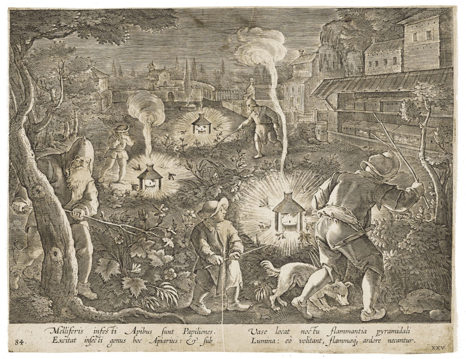 Les papillons de nuit sont attirés par nos éclairages, étonnant pour des êtres qui ont justement choisi l’obscurité ! En fait, noctuelles et autres phalènes s’orientent avec les sources naturelles de lumière nocturne, la lune surtout. Lorsqu’en 1880, Thomas Edison brevette l’ampoule électrique, la vie de ces papillons change radicalement avec l’apparition de milliers de fausses lunes qui sont aujourd’hui des milliards. Imaginez une noctuelle qui décide de voler tout droit en se fiant à l’astre de la nuit. Si son repère est en fait un lampadaire, le papillon va tourner, tourner encore puis se rapprocher. Il va alors s’épuiser, se brûler ou se faire manger souvent même avant d’avoir pu se reproduire. Cette attraction est connue depuis plusieurs siècles. Sur cette gravure du Flamand Cornelis Galle l’Ancien datant de 1596, on distingue des personnages qui utilisent des lanternes pour attirer et détruire des papillons jugés nuisibles pour les abeilles.