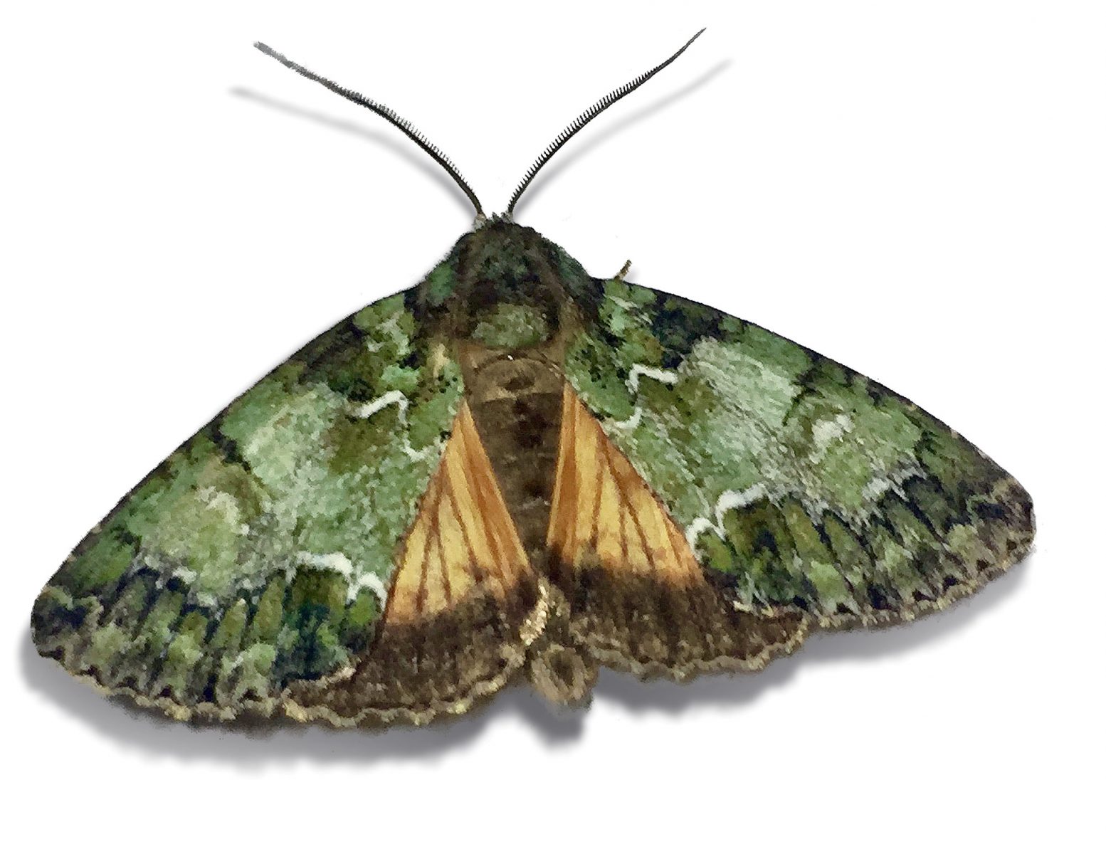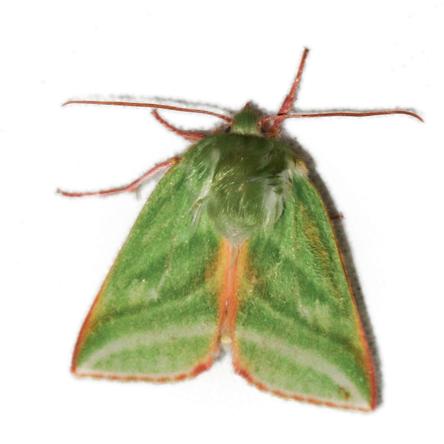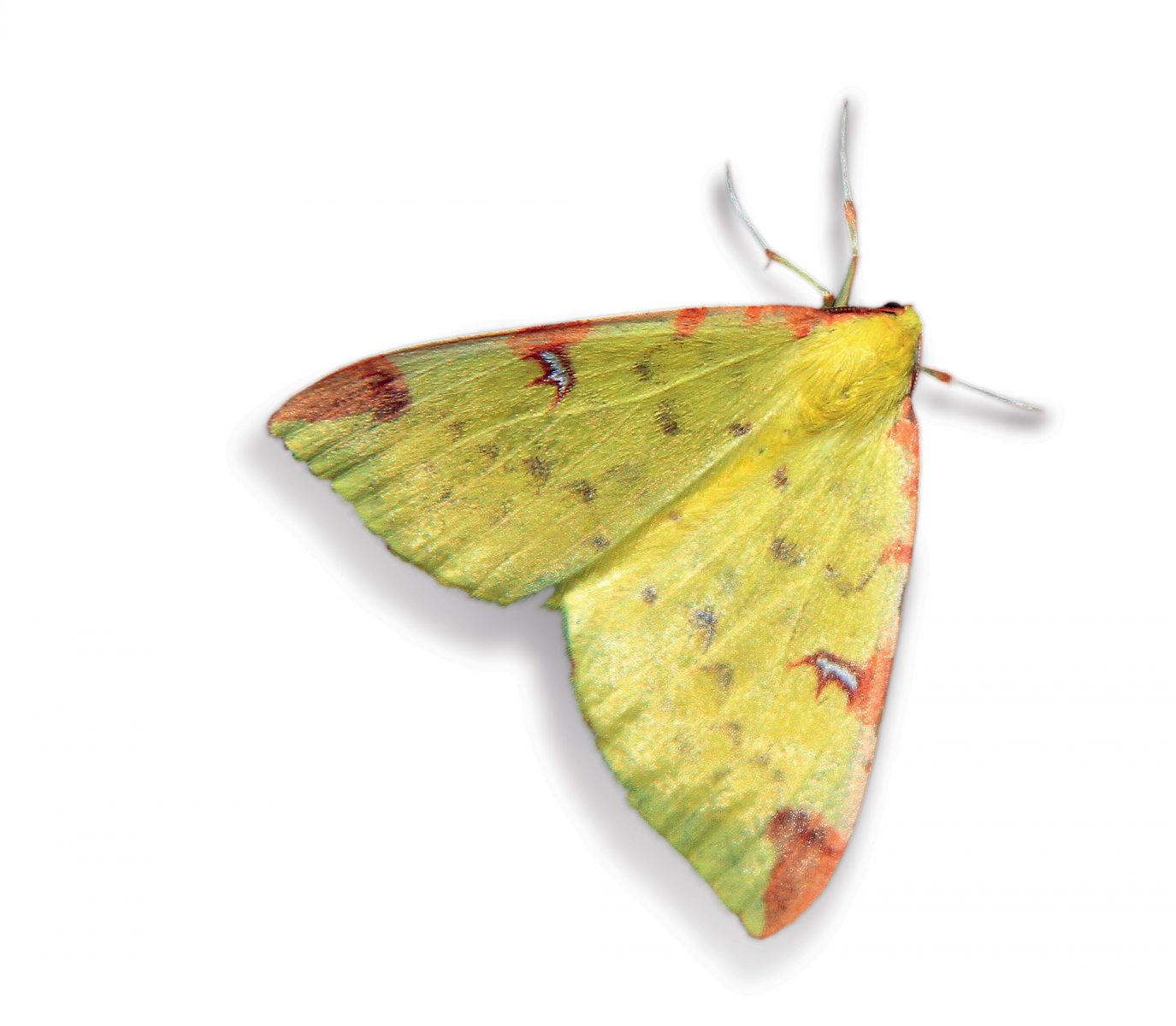 Le ton est donné, un superbe sphinx du tilleul forme rouge est arrivé (> Les colibris quiproquo p. 40). Pendant ce temps, la hulotte chante à tue-tête. Cela me fait penser qu’un papillon de nuit commun porte aussi ce nom de chouette. Je fais le tour de la tente illuminée en prenant garde de bien protéger mes yeux et de ne jamais regarder directement la LED. J’identifie un dragon aux ailes en toit sur le dos, un halias du hêtre dans sa livrée vert frais, une eupithécie couronnée et plusieurs troénières, espèce abondante en ce moment.