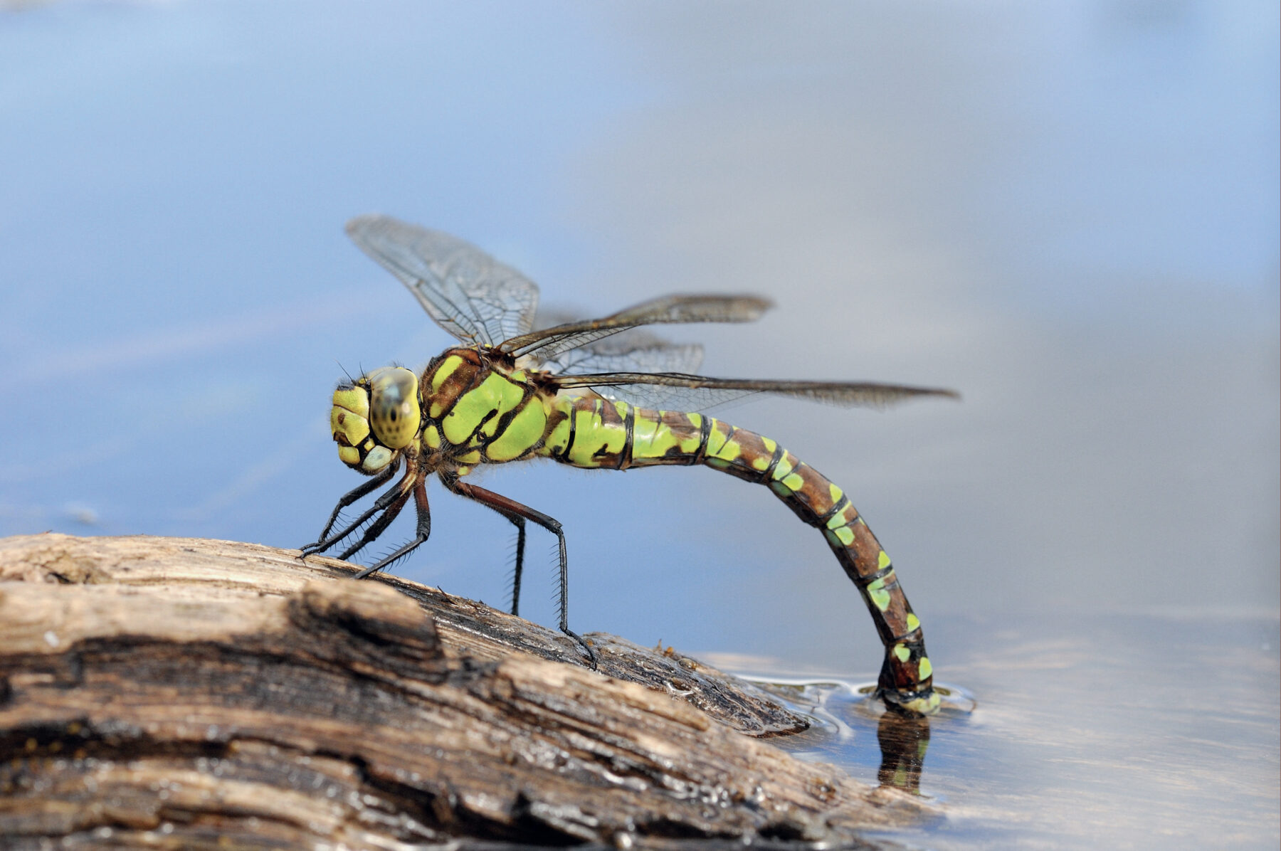 Les libellules ont besoin d’eau pour pondre. Si leurs œufs ne sont pas lâchés à la surface, ils sont déposés dans la végétation aquatique, sur un morceau de bois flottant ou une mousse imbibée. L’æschne bleue choisit souvent une mare ou une rivière calme. Pour s’adapter au manque de points d’eau, elle peut se contenter d’une simple flaque, voire d’un récipient où stagnent quelques centilitres du précieux liquide. Un coup de poker, car la larve aquatique se développe en un ou deux ans. Si le lieu de ponte s’assèche, c’est la mort assurée... Mais s’il est alimenté par des précipitations régulières, cette libellule pionnière sera peu concurrencée pour chasser sous le soleil.