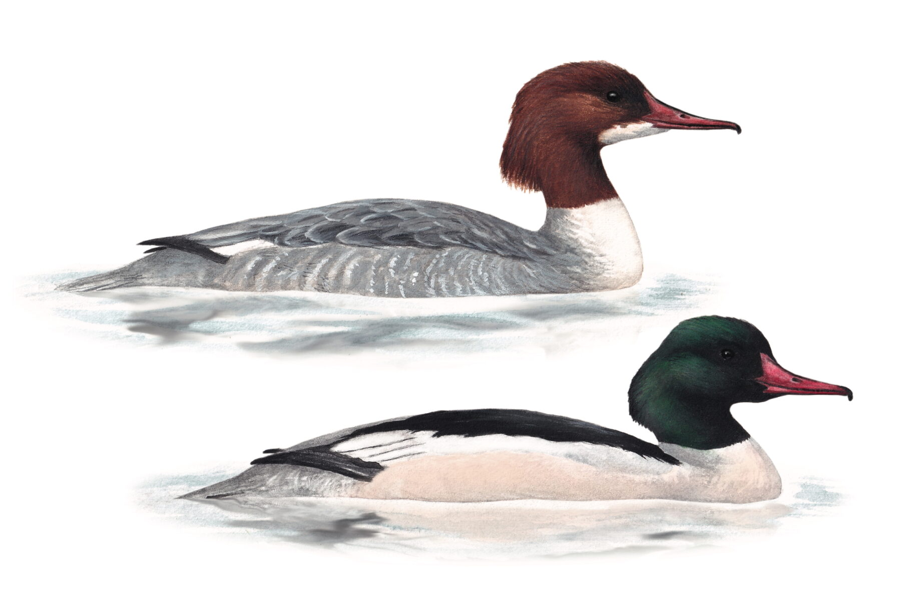 Les parades battent leur plein chez les harles bièvres. Les lacs brillent de leur présence bigarrée, les rivières scintillent sous leurs envols puissants. Certains de ces canards piscivores au bel dentelé repartiront dans le Grand Nord. D’autres nicheront ici sur les eaux des régions périalpines.