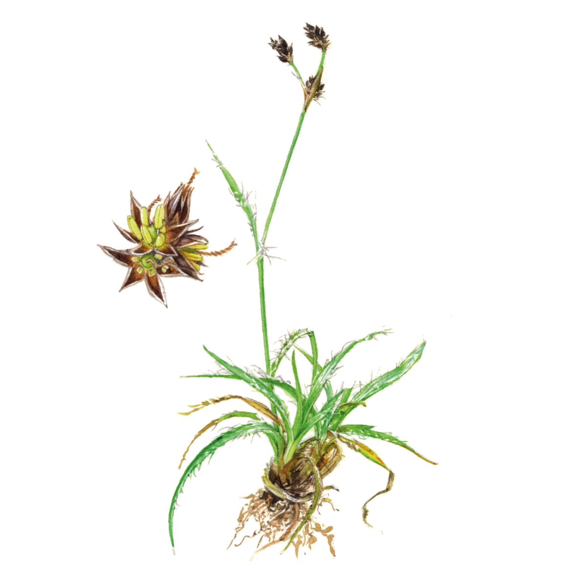 Des fleurs ! La fine tige de la luzule des champs se balance dans le vent, qui disséminera son pollen. Vous pouvez observer ses fleurs brun et jaune, regroupées en glomérules compacts (de deux à six), dans des prairies dont le sol est pauvre en substances nutritives. On reconnaît aussi la luzule à ses feuilles agrémentées de longs poils.
