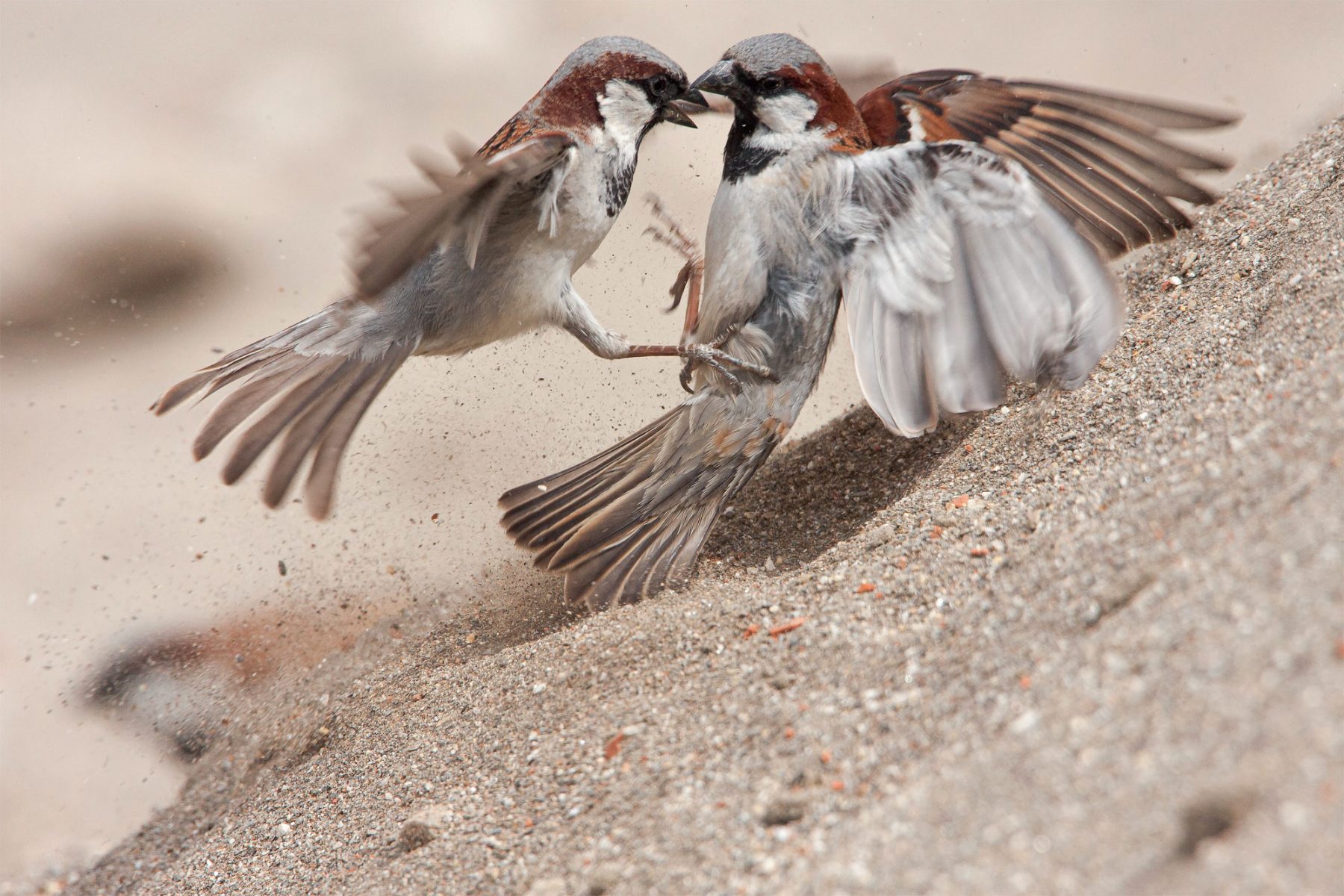 Autour des colonies souvent modestes de 10 à 15 couples, les relations sont explosives. Envers les moineaux étrangers comme entre mâles voisins, les poursuites aériennes rocambolesques se finissent dans de véritables bastons de quartiers. Il n’est pas rare de voir ces querelleurs agglutinés en tas de plumes dans le vacarme de leurs cris cumulés. Il a le sang chaud, le moineau !