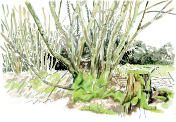 A bien observer ce coudrier, plus imposant que le chèvrefeuille, mais modestement abrité sous les grands frênes, on ne saurait dire si c’est un arbre ou un arbuste. Ni l’un ni l’autre en réalité : sa propension à ne pas développer de véritable tronc et à se ramifier dès la base fait du noisetier un arbrisseau. Quel enfant des campagnes n’a jamais profité de cette morphologie pour tailler un arc, une gaule de fortune ou une canne pour son aïeul ? Qui se souvient encore de l’ancien du village qui fagotait le généreux noisetier à la serpe pour se chauffer ? Aujourd’hui, on y taille tout au plus un échalas pour tuteurer un frêle pêcher ou la charpentière d’un pommier trop chargé.