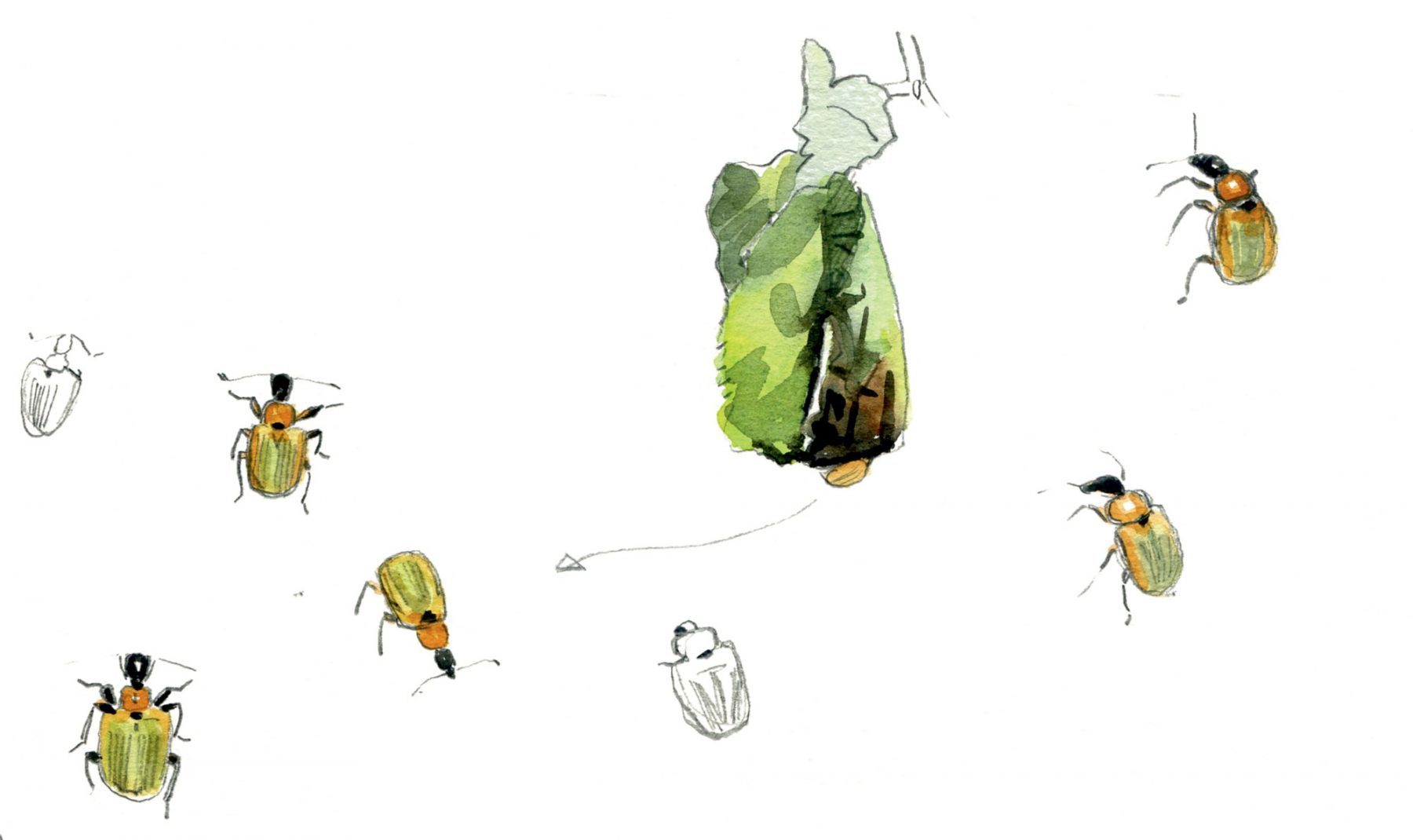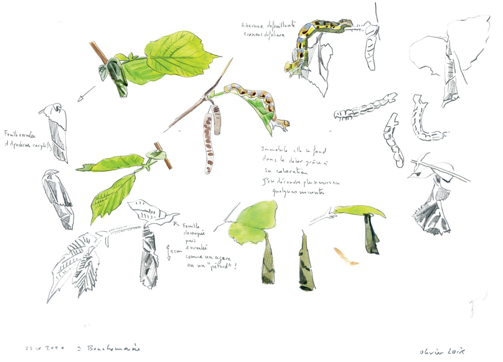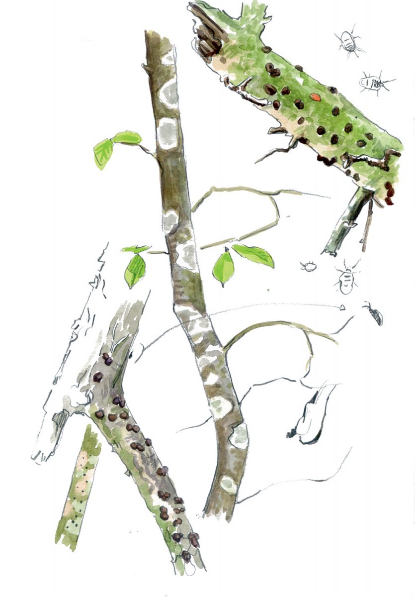 Contrairement au balanin qui pond dans le fruit, l’apodère du noisetier exploite le feuillage. La femelle de cet astucieux coléoptère découpe une feuille à moitié, l’enroule et modèle une sorte de cornet. Elle dépose ses œufs à l’intérieur. Les cigares ainsi formés dépérissent plus vite que les feuilles saines et se remarquent aisément. Pour observer cet insecte rouge vif, secouez un noisetier à la belle saison au-dessus d’un drap ou d’un parapluie retourné.
