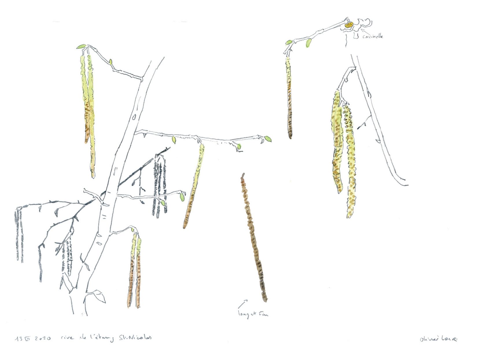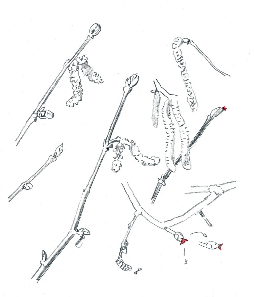 Justement, il y a un signe qui ne trompe pas à la lisière du jardin. Porté par un petit souffle de bise, un nuage de poussière d’or s’envole vers la forêt. C’est le noisetier qui offre sa semence au vent. Voyez comme les chatons mâles sont ouverts et généreux. Une simple pichenette et leur poudre de pollen part à l’aventure, défiant les lois de la probabilité et du hasard pour rencontrer une fleur femelle. Approchons…