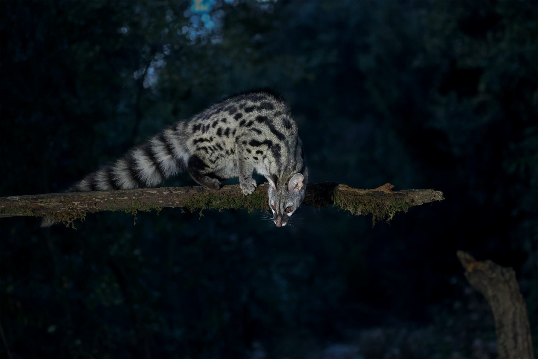 Un soir de janvier 2023, je m’installe dans l’affût. Des rougegorges viennent se désaltérer. Tout est tranquille quand, au bout de dix minutes, une genette déboule avec ses deux jeunes. Il est 18 heures, il fait encore un peu jour. Je suis totalement pris au dépourvu, car je pensais passer des heures sans bouger. C’est alors qu’un autre adulte arrive. Les genettes sont restées trois heures au bord du point d’eau. À un moment donné, l’une d’elles vient tout près, sur une branche moussue. Je la photographie à l’instant où elle se tourne pour redescendre au sol. La distance d’observation est tellement réduite que je n’ai pas besoin de téléobjectif. C’est mon cliché préféré de cette soirée magique.