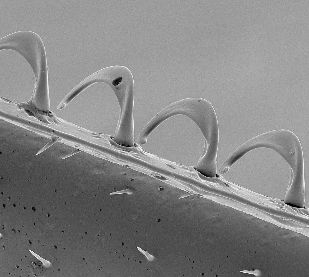 TRANSPORTER - Entre deux fleurs, l’abeille domestique saupoudrée de pollen engrange sa récolte dans les corbeilles de ses pattes arrière. Elle se brosse avec ses autres membres, humectant le pollen de nectar. Puis elle le transfère vers l’arrière. Elle frotte ses pattes postérieures l’une contre l’autre et s’aide du râteau et des brosses de ses tibias pour glisser son butin au fond des corbeilles. Ainsi, la pelote de pollen grossit un peu plus à chaque étape.