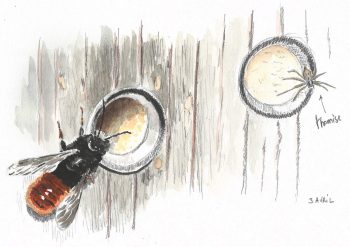 Mon regard est attiré un peu à droite par une bestiole insignifiante. Une araignée. Toute frêle avec une silhouette de bébé crabe, elle ne paye pas de mine. Alerte ! La sous-estimer serait une erreur. C'est une thomise, une araignée tueuse d'abeille. Elle chasse à l'affût, sûre de son mimétisme. Malgré la différence de taille, son objectif est bien de s'offrir une osmie en guise de casse-croûte ! Dans ces cas-là, éviter la prise de parti sensible et peu objective qui consisterait à éjecter l'araignée dans le décor d'une simple pichenette...