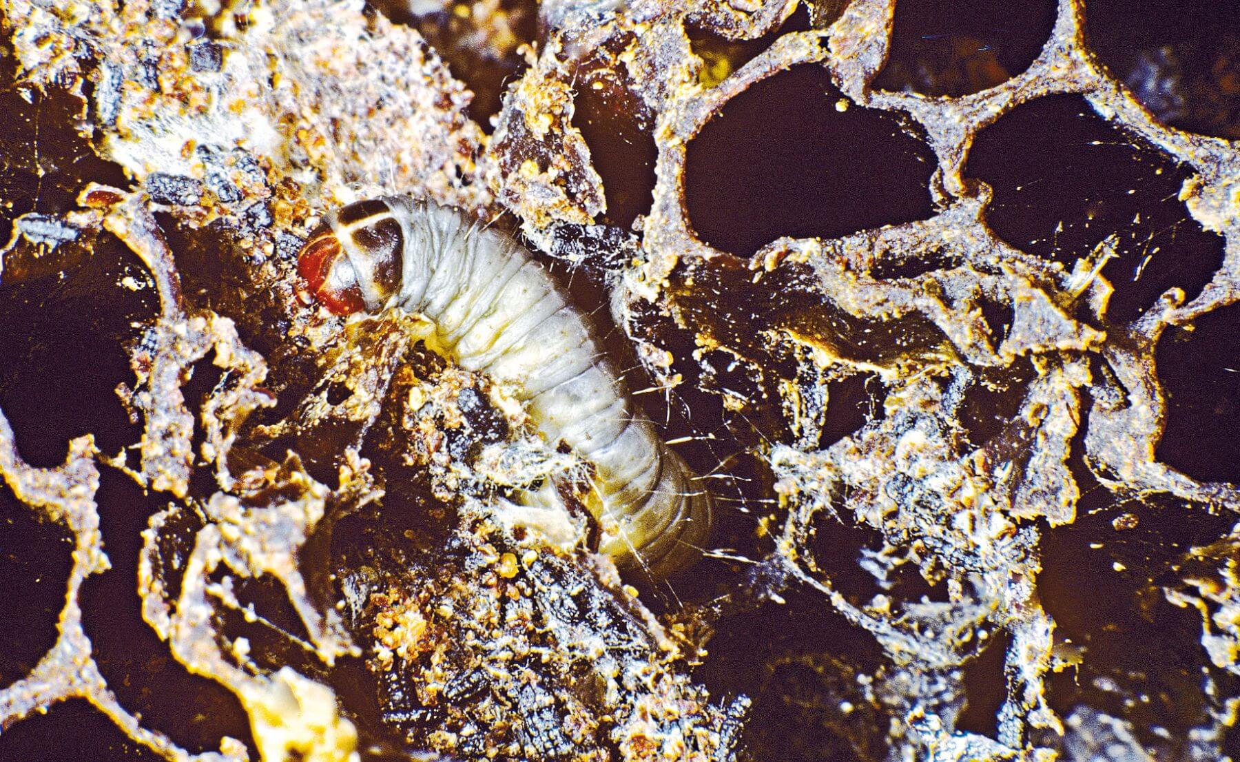 Plus petites, les teignes font aussi beaucoup plus de dégâts. Ces papillons pondent de nuit dans les rayons. Leurs chenilles se nourrissent de pollen, de restes de cocons et de cire, et tissent de longues galeries de soies.