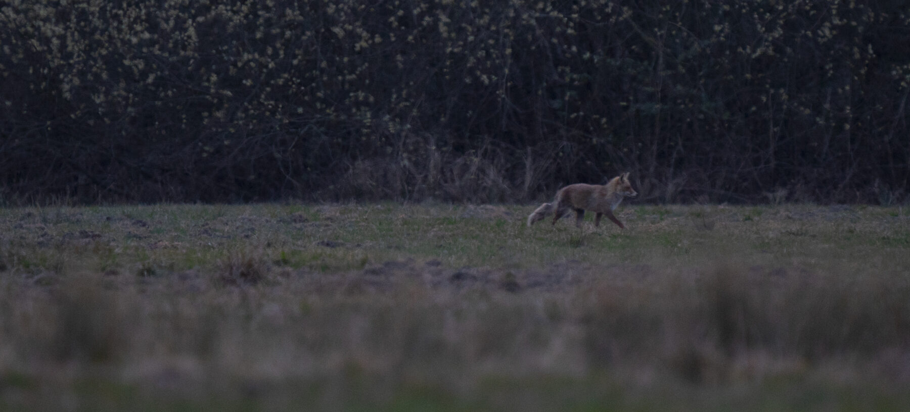 Nous nous installons dans à la lisière d'une clairière où j'ai déjà vu des chevreuils assez souvent, nous taisons, et devenons le plus immobiles possible. Au bout d'un certain temps, deux renards sortent de la forêt, puis un troisième plus petit apparait. Ils jouent et mulotent jusqu'à ce que la nuit tombe. Ce troisième petit renard est surement un jeune gringalet de la portée de l'année dernière.