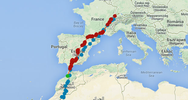 Quant à Milou, il a traversé le Lac Léman le 31 juillet pour se rendre en Ardèche où il a passé 4 nuits. Le 5 août, il a poursuivi son voyage vers les Pyrénées. Il a traversé l’Espagne en même pas quatre jours et est arrivé au Maroc le 10 août (en 2013 c’était le 5 août). Sans tarder, il a poursuivi son chemin vers la Mauritanie où il est arrivé le 14 août. Pour le moment, il suit assez précisément son itinéraire du mois d’août 2013.