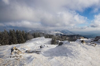 Au sommet du mont de Baulmes, érables sycomores, frênes et foyards centenaires forment une allée d’arbres majestueuse qui conduit au belvédère. La bise est vive, entraînant à toute vitesse les nuages qui caressent les crêtes. Aujourd'hui, tant la lumière que le panorama sont exceptionnels. Le ciel dessine toutes les nuances de gris possibles, parfois rehaussées par un peu de bleu ou d'or. Mais ces nuages chassés à toute allure descendent si bas qu’ils ne laissent guère de place aux Alpes habituellement bien visibles.