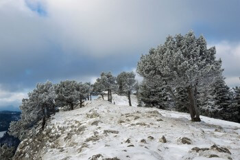 Un peu plus loin, des pins à crochet malmenés par les intempéries s’agrippent aux rochers de part et d’autre du sommet des Aiguilles. Leur aspect trapu trahit un âge avancé malgré une faible taille. Dans le Jura, on ne rencontre cette essence ultra-rustique que sur quelques rares crêtes exposées. J’embrasse encore du regard le Suchet tout proche et l’imposante muraille du Mont d’Or de l’autre côté de la frontière française avant de m'enfoncer dans la forêt sous les cris intempestifs d’un grand corbeau.