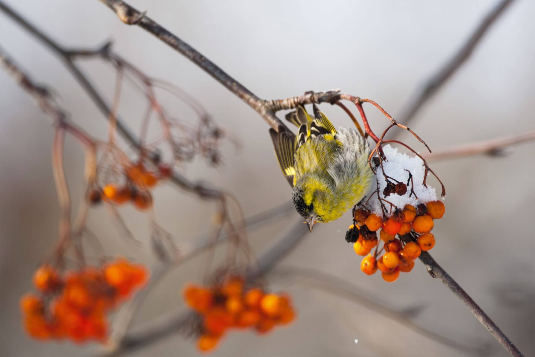 Le long du sentier, les sorbiers des oiseleurs ont mis leur costume de carnaval. Ces arbres de lumière apprécient la crête clairsemée. Un petit groupe de tarins des aulnes s’est abattu sur leurs belles grappes de fruits rouge orangé. Les baies sucrées et vitaminées sont une aubaine en période de disette. Grives, merles et bouvreuils se partagent en hiver les fruits de cet arbre bien nommé.