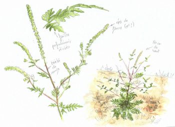 Cela faisait plusieurs jours que je la voyais sans la regarder. Pourtant elle est immanquable au milieu de l'herbe rase et jaunie de fin d'été : presque 80 centimètres de hauteur, de couleur vert sombre avec des feuilles très découpées, une tige rougie surmontée de fleurs en épis vert-jaune. Je décide de creuser l'affaire car un doute s'installe en moi. Ne serait-ce pas la fameuse ambroisie ? Un livre et trois clics plus tard, la certitude est là. Il s'agit de l'ambroisie à feuilles d'armoise (Ambroisia artemisiifolia) réputée très allergène et ennemi végétal n°1 de la santé publique, aussi bien en France qu'en Suisse.