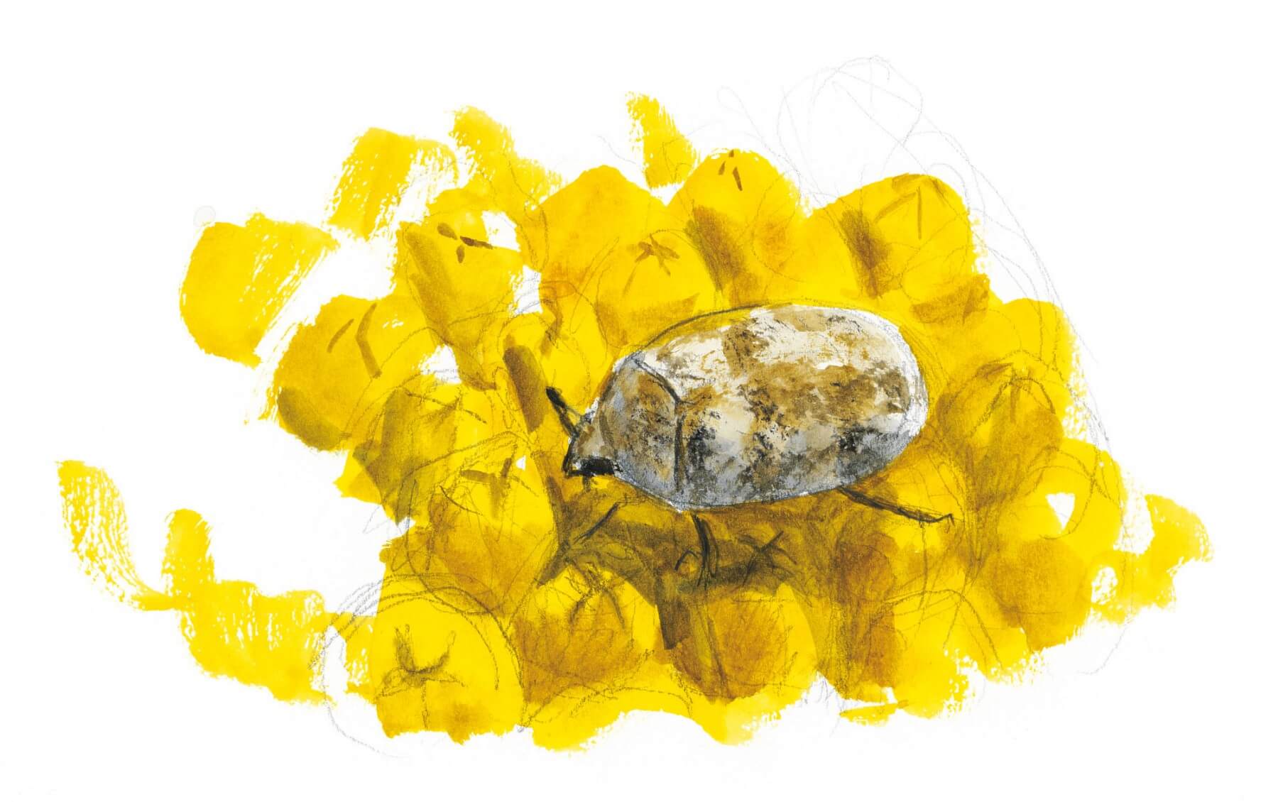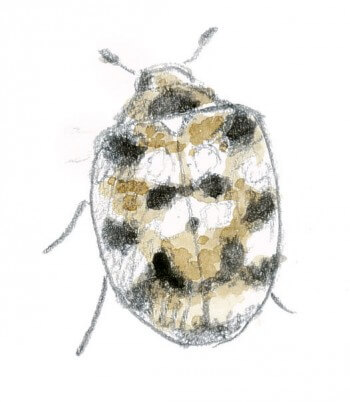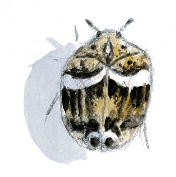 Des coccinelles ? Non, ce sont des anthrènes. Les élytres de ces petits coléoptères présentent des motifs géométriques aux tons gris, ocre, noir et blanc. Ils sont formés par de fines écailles qui couvrent la carapace. Beaucoup d'espèces consomment du pollen, mais aussi la matière organique sèche des nids d'oiseaux ou la poussière des maisons.