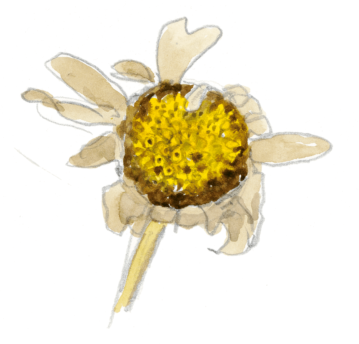 Fin de floraison. La marguerite abandonne sa robe colorée pour se concentrer sur la production de graines. Chaque plant produit entre 1000 et 26'000 semences. Contrairement à celles du pissenlit, elles ne possèdent pas d'appendice aérien. Du coup, elles dépendent d'événements accidentels tels les inondations ou le transport par un animal pour s'installer dans un endroit propice. Patientes, ces graines sont capables de survivre dans le sol une quarantaine d'années.