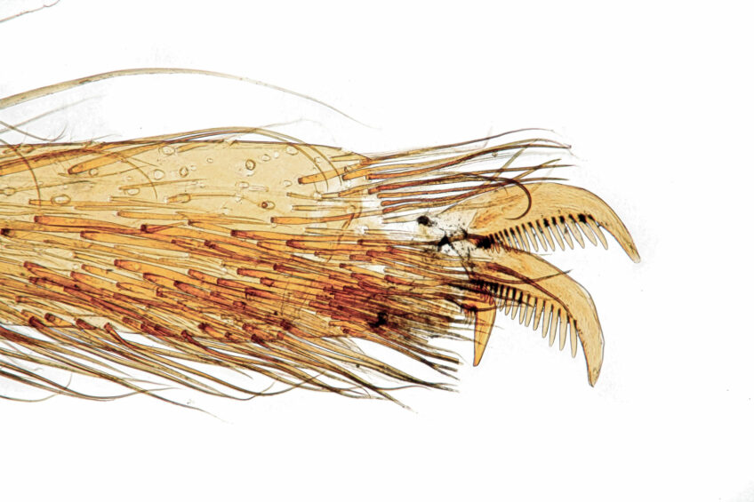 Vue détaillée de l’extrémité d’une patte de tégénaire