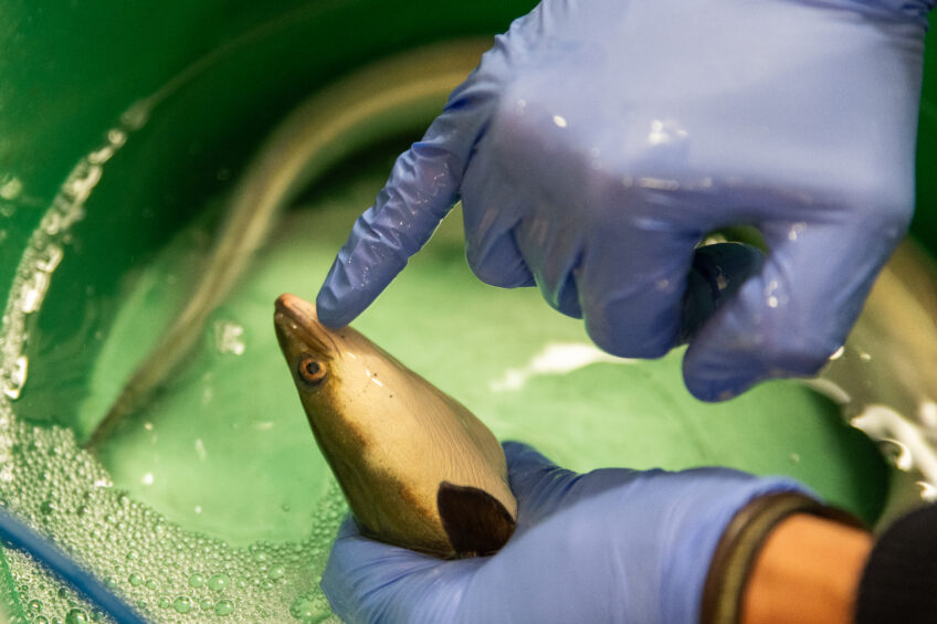 Après avoir dicté à son équipe quelques mesures des nageoires, du corps et de l’œil, la scientifique remet le spécimen à Samuel Hilaire, un technicien habilité à effectuer le marquage. Il pratique alors une fine incision et intègre une petite puce. Un protocole réalisé depuis vingt-trois ans sur les anguilles capturées de plus de 30 cm. Les données relevées permettent aux scientifiques de déterminer où en sont les anguilles dans leur métamorphose et dans leur préparation à la migration transocéanique. Delphine passe un appareil pour tester le bon fonctionnement de l’équipement qui bipe aussitôt.
