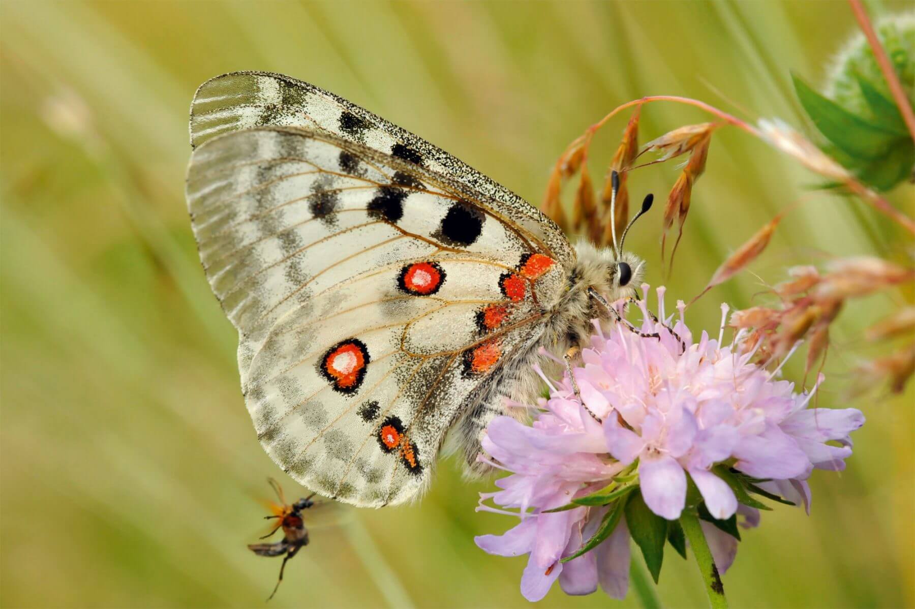 L’apollon est un papillon montagnard qui aime la chaleur. Il peuple une grande partie des massifs européens et se rencontre généralement entre 700 et 2000 mètres dans les endroits secs et pierreux ou les prairies maigres. Actif entre mai et septembre selon l’altitude, l’adulte se reconnaît de loin à sa grande taille et à son vol nonchalant ponctué de voltiges. Pour tenter de l’observer en train de butiner, guettez les chardons ou les scabieuses aux heures les plus chaudes. Les œufs sont confiés à l’orpin blanc, une plante grasse inféodée aux sols arides.