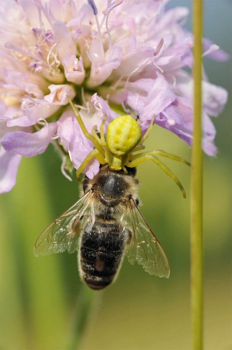 Mon goût pour les prairies ? Il remonte à l’enfance quand j’ai découvert ces milieux et leurs étranges habitants. Couchez-vous dans l’herbe : vous découvrirez un véritable microcosme. En été, proies et prédateurs jouent à cache-cache dans une dangereuse promiscuité. L’araignée thomise se tient à l’affût sous la corolle butinée par une abeille, la mante religieuse s’empare d’une sauterelle avec une détente fulgurante. Et l’ascalaphe ? Mi-papillon mi-libellule, ce chasseur coloré patrouille son bout de pré en quête de moucherons.