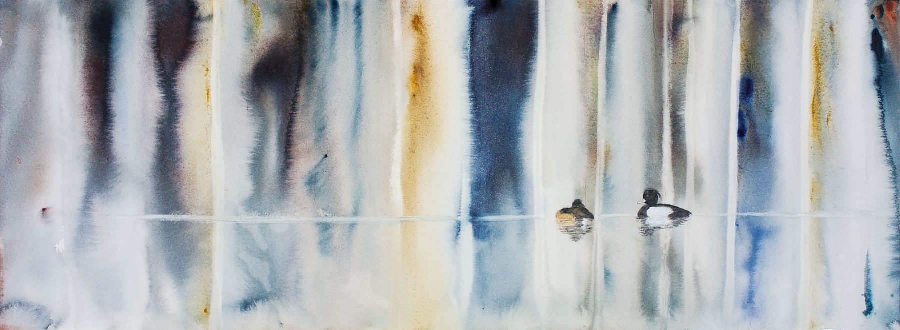 J'aime travailler sur de grandes feuilles de papier que je mouille complètement avant de jouer avec mes pigments. Mais cette technique n'est pas toujours pratique à utiliser sur le terrain. Parfois je m'y essaie, en d'autres occasions je croque des aquarelles en petit. En atelier, sur grand format, j'aime me lâcher complètement dans mes effets d'eau, de lumière et de couleur pour traduire l'émotion d'origine. Plus que des observations précises, ce sont bel et bien mes émotions que j'ai envie de partager. J'aime les ciels gris, les brumes traînantes et les reflets aquatiques de ma région. Transparence, lumière et pigments. Seule l'aquarelle retranscrit aussi finement ces réalités subtiles. En général, je pars sur le terrain sans réserve d'eau, ce qui est plutôt inhabituel pour un aquarelliste. Je me contente d'une petite bouteille vide. Car j'ai pris l'habitude de recueillir un peu de l'eau qui m'est offerte sur place par la nature. C'est devenu une sorte de rituel. Elle n'est pas toujours totalement claire mais j'ai trouvé ainsi ma manière toute personnelle de rendre grâce aux lieux. »