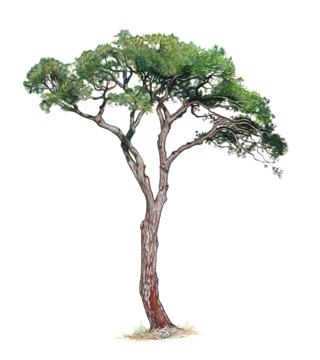 À ne pas confondre avec le pin parasol, dont les cônes sont plus ronds. Son écorce forme de grandes plaques orangées.