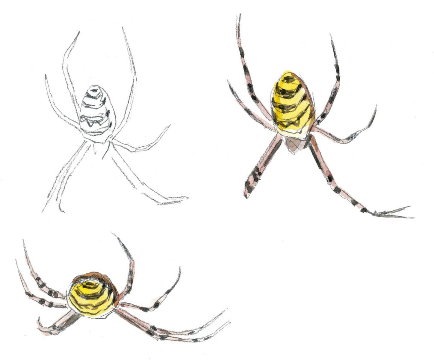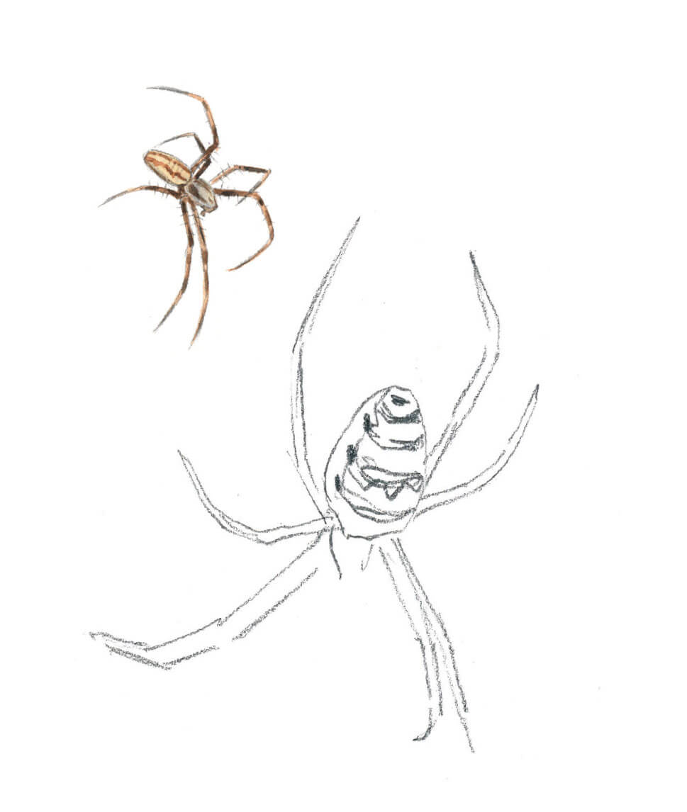 Brodée de soie, la victime est ensuite transportée au cœur de la toile. La table est mise… Mais le repas est interrompu par l’arrivée d’une araignée grêle aux stries pâles nettement plus petite que la propriétaire des lieux. Une épeire mâle ! La femelle hésite : manger ou s’accoupler ? Les deux peut-être... Il arrive en effet qu’en pleine copulation, l’argiope commence à entourer de fils son partenaire, puis qu’elle lui injecte du venin, puis qu’elle le dévore…