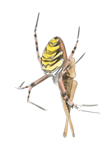 Les araignées, c’est le monde à l’envers. Non seulement la plupart d’entre elles vivent la tête en bas, mais en plus elles digèrent… avant d’avoir mangé. Après avoir paralysé sa victime par une morsure, l’argiope frelon régurgite des sucs digestifs et les injecte dans la blessure. Ensuite, elle suce les tissus partiellement digérés de sa proie avec son jabot en forme de paille. Parfois, l’exosquelette vide reste en place sur la toile comme un trophée de guerre.