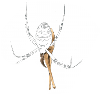 La fraîcheur de la nuit a recouvert les herbes de gouttelettes. Toutes ces miniperles de rosée trahissent les nombreux pièges de soie tendus pendant la nuit. Une splendide toile miroite au soleil levant. Quelle couturière a tissé cette construction géométrique ? Un épais zigzag blanc brodé en son centre ressemble à une signature. Cette décoration est considérée comme la marque de fabrique exclusive des argiopes… même si toutes n’en tissent pas forcément, et que d’autres espèces d’araignées en font aussi.
