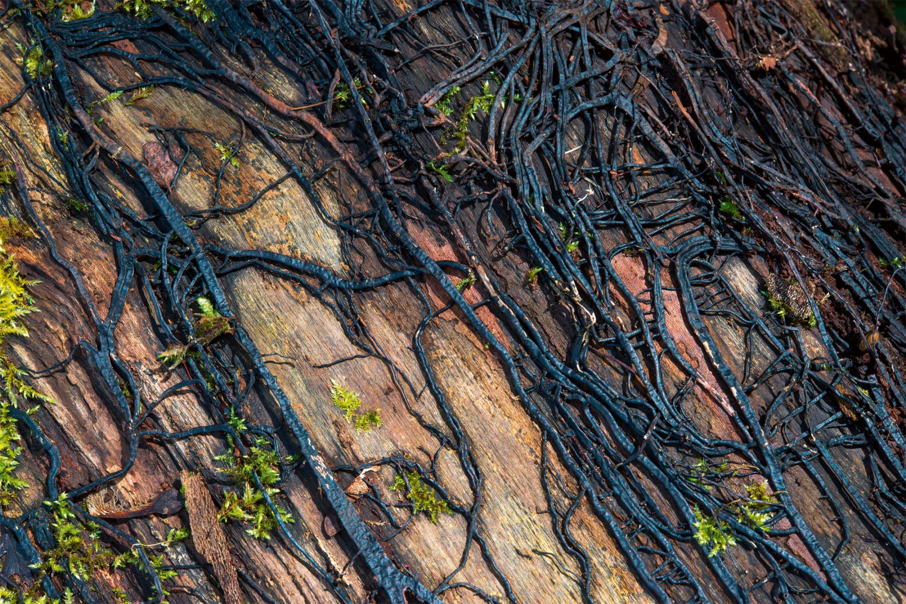 La présence sur le tronc de rhizomorphes, ces redoutables cordons noirs typiques des armillaires, signifie que l’arbre est condamné.