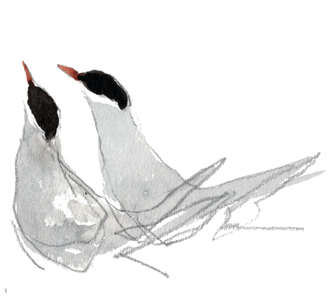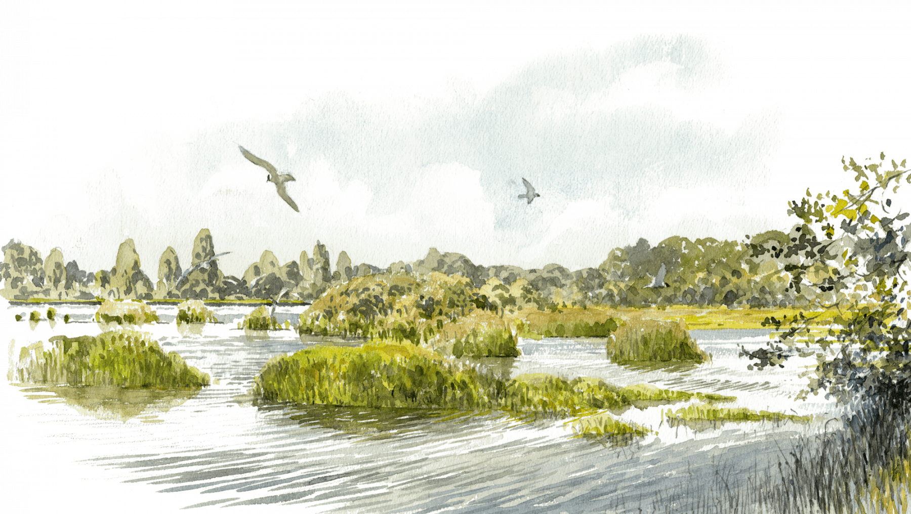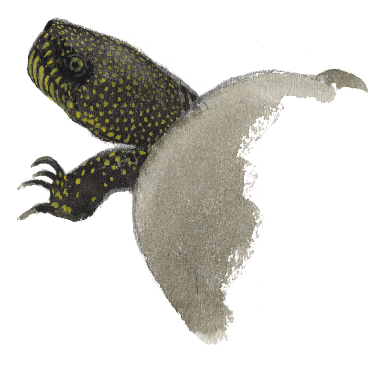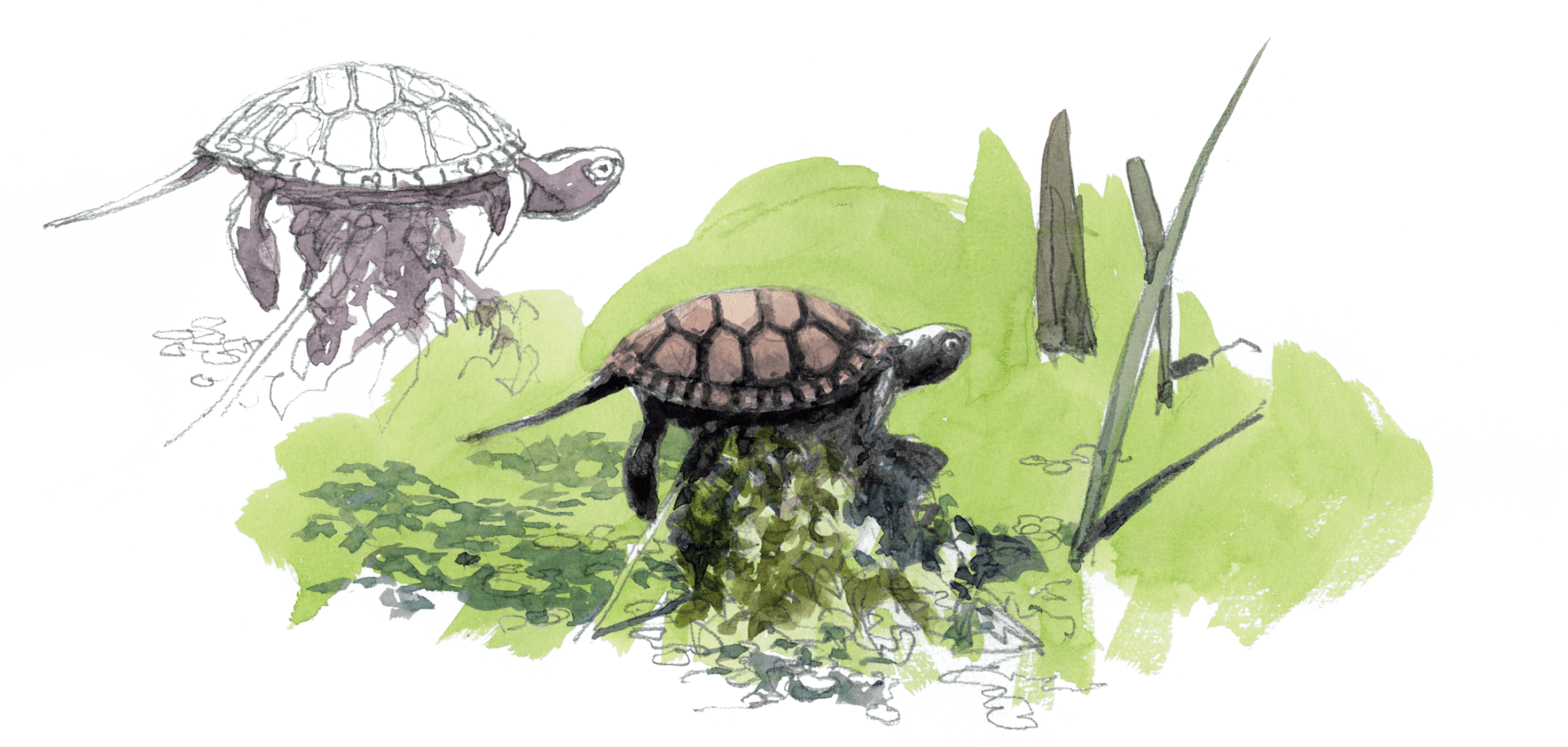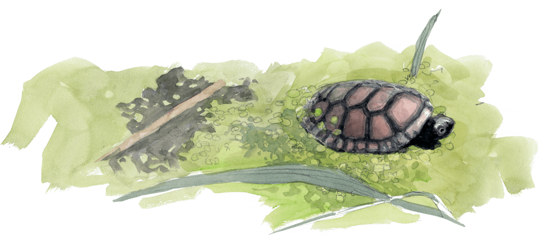 Le lendemain matin, le soleil arrive enfin. Devant la Maison de la nature de la Réserve naturelle nationale de Chérine, nous retrouvons le peintre naturaliste Denis Clavreul venu tout exprès de Nantes pour illustrer ce reportage. La passerelle qui permet d’entrer dans le centre d’accueil enjambe une mare couverte de lentilles d’eau. On scrute à tout hasard la surface. Un, deux, trois… quatre minuscules bébés tortues se cramponnent tant bien que mal à des branches ou à des tiges sèches.