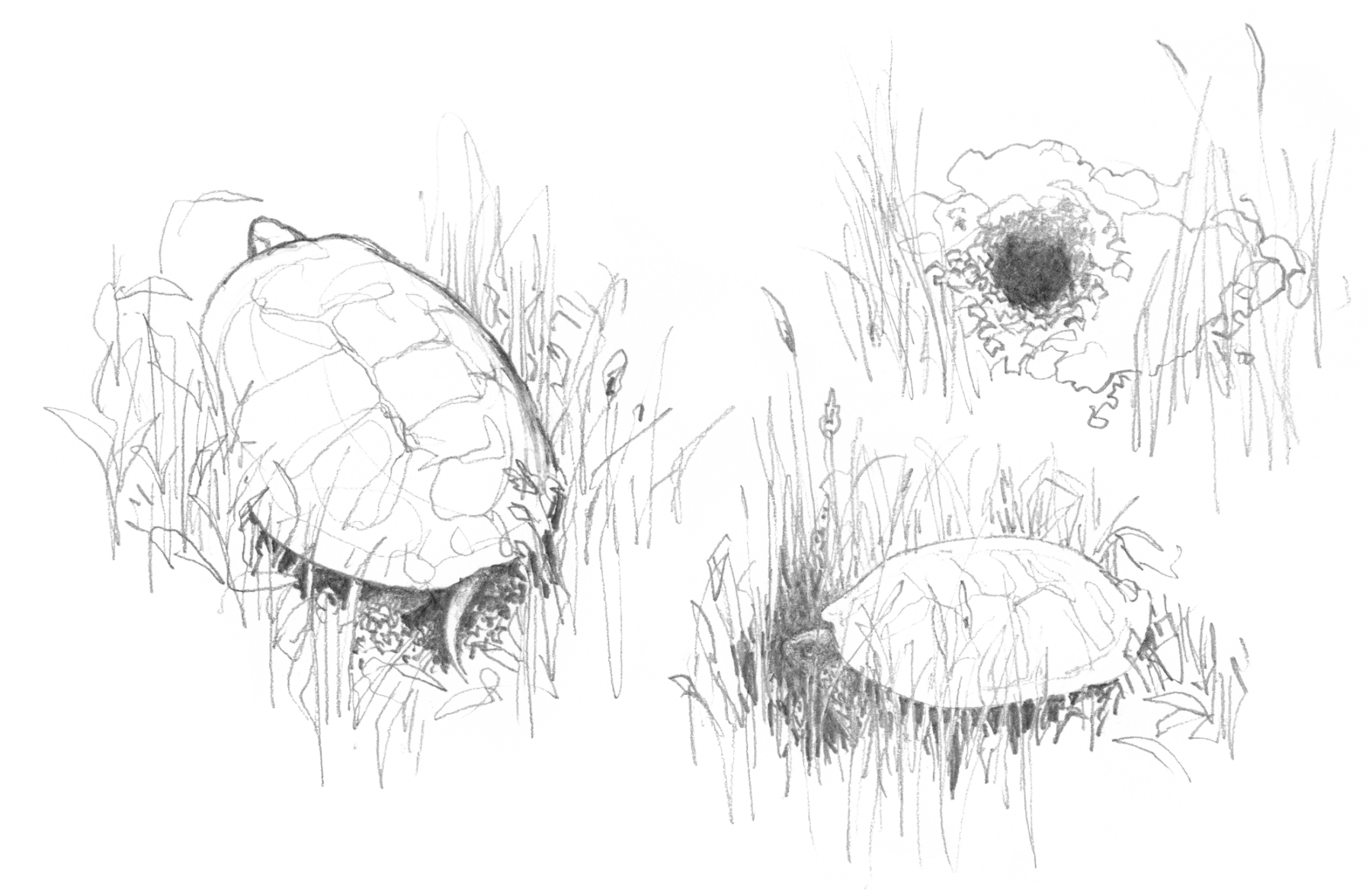 « En général, la cistude ameublit la terre en vidant ses deux réservoirs à eau. Puis elle creuse un trou en forme de poire profond d’une dizaine de centimètres : la longueur de ses pattes. Il ne faut surtout pas nous approcher ! Dérangée, elle risque de s’immobiliser pour de longues heures ou d’abandonner. En revanche, une fois que la mécanique est enclenchée, j’ai observé que plus rien ne l’arrête, pas même parfois la présence d’un prédateur. La tortue dépose délicatement ses œufs un à un au fond du trou avec l’aide d’une de ses pattes aux griffes rétractées. Puis elle rebouche la terre et tasse finalement le tout avec son plastron. »