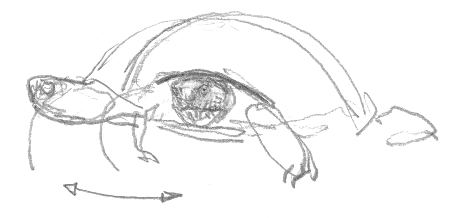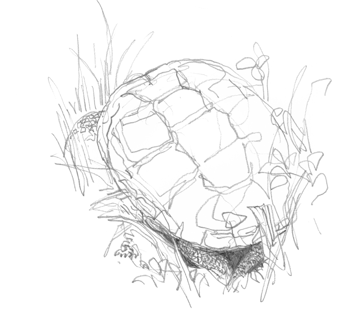 En effet, un dos rond avance devant nous en se dandinant de droite, de gauche. La cistude longe les hautes herbes du talus. Et tout à coup, elle bifurque à angle droit et disparaît entre les graminées. Incroyable, on dirait qu’elle sait exactement où elle va. Un peu plus loin, nous surprenons sur le chemin une corneille qui n’est probablement pas là par hasard.