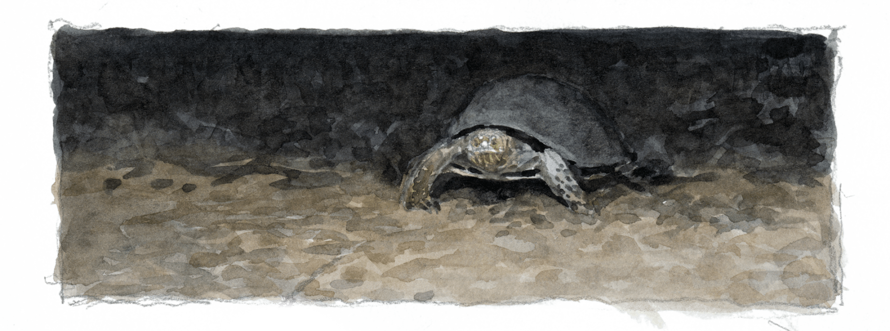 Ici ou là, il y a des trous de ponte visibles, signe de prédation ou de creusage interrompu. Et voici cent mètres plus loin une nouvelle tortue en plein chantier. Et bientôt une troisième. On regarde ses pattes fouisseuses à l’œuvre à travers nos jumelles. Denis dessine. A l’instant où je lève les yeux de sa feuille, me voici nez à nez avec un blaireau qui fait sans doute ses courses le long du chemin…